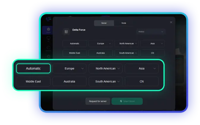 Нажмите на вашу игру, затем выберите сервер и узел с наименьшим пингом, или просто выберите Автоматический сервер и позвольте LagoFast найти лучшее соединение.